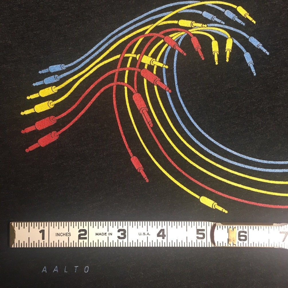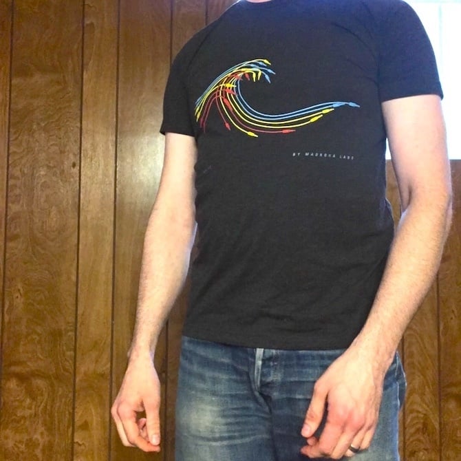 The Aalto "wave" design by David Chandler in crimson, yellow and blue, on a dark gray tri-blend shirt by Bella+Canvas.